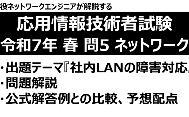 応用情報技術者 【応用情報】令和7年度春季試験 午後問題 問5:ネットワーク【YouTube解説動画あり】 応用情報技術者試験の令和7年度 春季試験 午後 問5:ネットワークの解説を行ってきます。 出題テーマ:社内LANの障害対応 出題テーマは『社内LANの障害対応』でした。 LANに関連するMACアドレス・ARP、サブネット分割といった一般的な... 2025.10.04 応用情報技術者