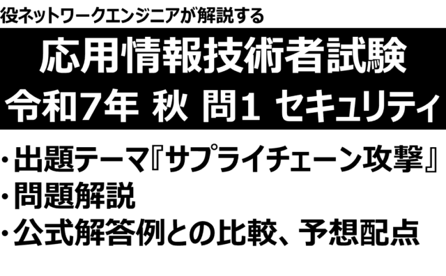 応用情報技術者 保護中: 【応用情報技術者試験】令和7年度 秋季試験 午後 問1:セキュリティ【YouTube動画あり】 このコンテンツはパスワードで保護されています。表示するには以下にパスワードを入力してください: パスワード: 2026.01.17 応用情報技術者