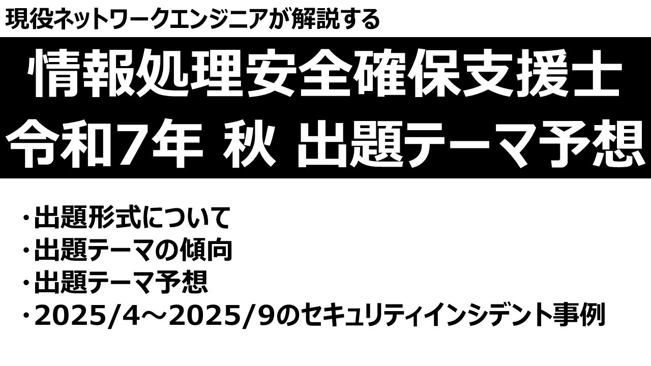今回は令和7年度春季試験が終了した2025年4月から試験直前の2025年9月までに実際に起ったセキュリティインシデントなどをご紹介しますが、これらは今回の令和7年度秋季試験には出題される可能性は低いです。