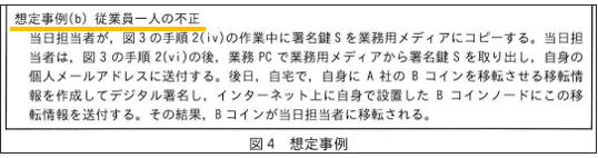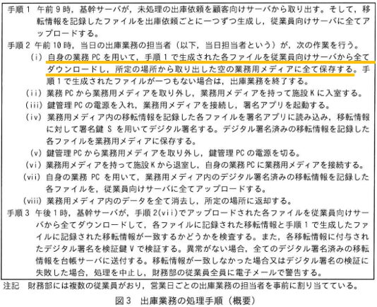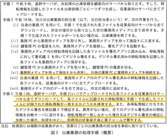 そして、手順3では、『基幹サーバが、手順2(ⅶ)でアップロードされた各ファイルを従業員向けサーバから全てダウンロードして、各ファイルに記録された移転情報と手順ⅰで生成したファイルに記録された移転情報が一致するかどうかを検査する。(中略)移転情報をが一致しなかった場合又はデジタル署名の検証に失敗した場合、処理を中止し、財務部の従業員全員に電子メールで警告する。』とあります。