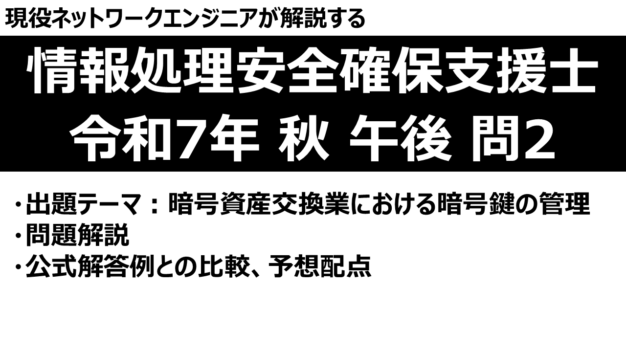 出題テーマは『暗号資産交換業における暗号鍵の管理』で、これまで出題があったのはTLSや証明書関連でしたので、少し毛色の違う暗号技術に関しての出題でした。
