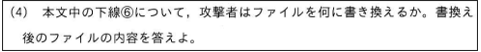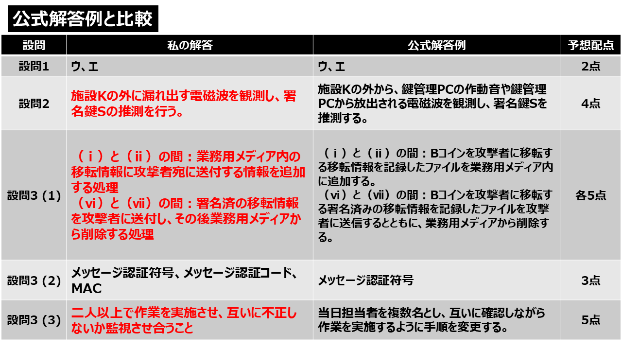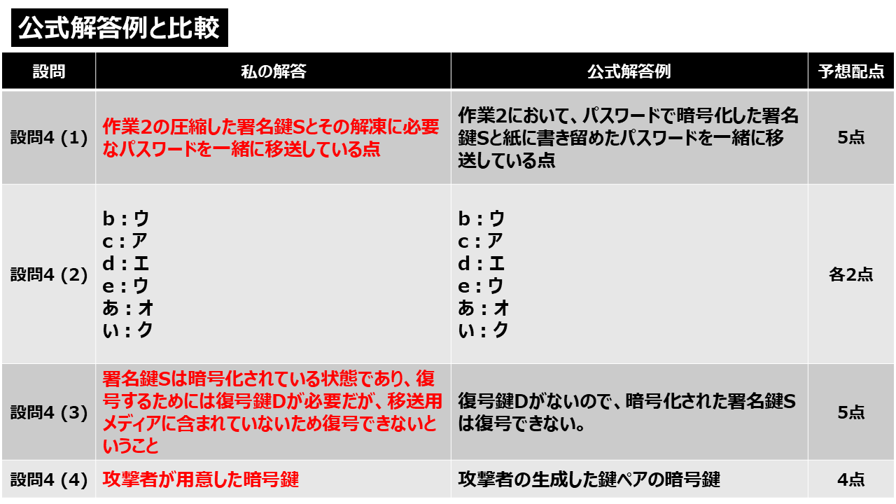 | 設問4 (3) | 署名鍵Sは暗号化されている状態であり、復号するためには復合鍵Dが必要だが、移送用メディアに含まれていないため復号できないということ | 復号鍵Dがないので、暗号化された署名鍵Sは復号できない。 | 設問4 (4) | 攻撃者が用意した暗号鍵 | 攻撃者の生成した鍵ペアの暗号鍵 |