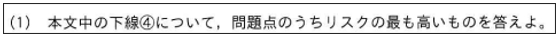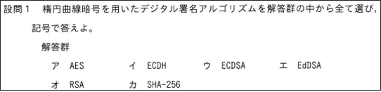 | 設問4 (1) | 作業2の圧縮した署名鍵Sとその解凍に必要なパスワードを一緒に移送している点 | 作業2において、パスワードで暗号化した署名鍵Sと紙に書き留めたパスワードを一緒に移送している点 | |