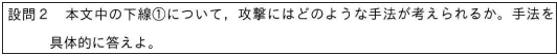 | 設問2 | 施設Kの外に漏れ出す電磁波を観測し、署名鍵Sの推測を行う。 | 施設Kの外から、鍵管理PCの作動音や鍵管理PCから放出される電磁波を観測し、署名鍵Sを推測する。 | |