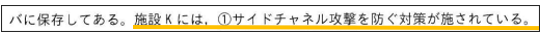 下線①として、『施設Kには、サイドチャネル攻撃を防ぐ対策が施されている。』とあります。