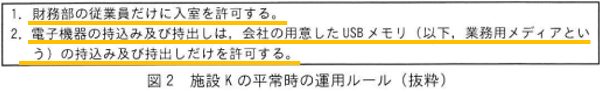 図2には施設Kの平常時の運用ルールが記載されており、『1.財務部の従業員だけに入室を許可する。 2.電子機器の持込み及び持出しは、会社の用意したUSBメモリ(以下、業務用メディアという)の持込及び持出しだけを許可する。』とあります。