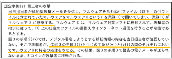 下線②として、『図3の手順2(ⅰ)と(ⅱ)の間及び(ⅵ)と(ⅶ)の間のそれぞれにおいてマルウェアXに特定の処理をさせる。その結果、図3の手順3で警告の電子メールが送られないまま、Bコインが攻撃者に移転される。』とあります。