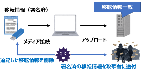 解答例は『署名済の攻撃者宛の移転情報を攻撃者宛に送付し、その後業務用メディアから削除する処理』と考えることができます。