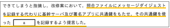 【a】の部分として、『照合ファイルにメッセージダイジェストを記録する代わりに基幹サーバ及び署名アプリに共通鍵をもたせ、その共通鍵を使った【a】を記録するように提言した』とあります。