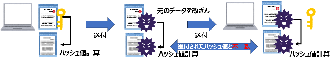 ただし、公開されているハッシュ関数を用いている場合は、攻撃者が元のデータを改ざんしハッシュ値を再計算することが可能となります。