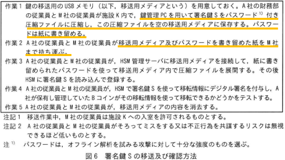 図6では『鍵管理PCを用いて署名鍵Sをパスワード付き圧縮ファイルに圧縮し、この圧縮ファイルを空の移送用メディアに保存する。パスワードは紙に書き留める。』とあります。