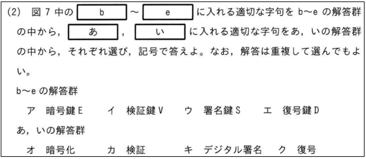 ということで、解答は『d:エ 復号鍵D』で『い:ク 復号』し、得られた『e:ウ 署名鍵S』となります。