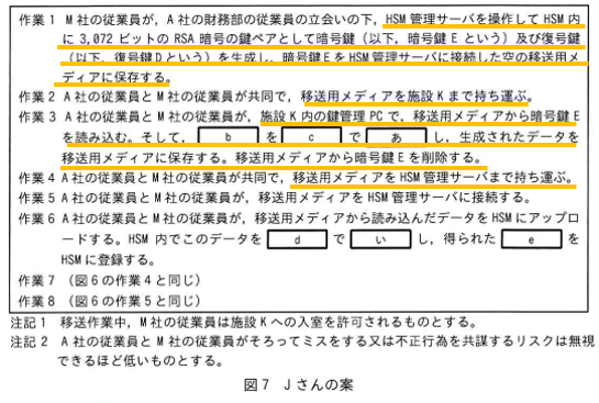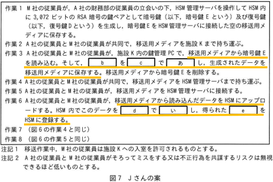 作業4としては、『A社の従業員とM社の従業員が共同で、移送用メディアをHSM管理サーバまで持ち運ぶ』とありますが、この作業4時点で、署名鍵Sは暗号鍵Eによって暗号化された状態で持ち運ばれています。