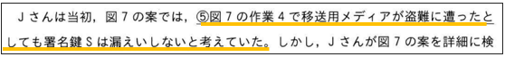 下線部⑤として、『図7の作業4で移送用メディアが盗難に遭ったとしても署名鍵Sは漏えいしないと考えていた。』とあります。