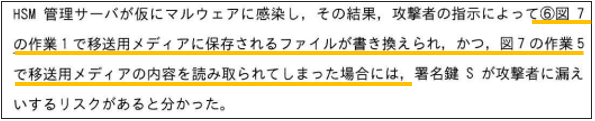 下線⑥として、『図7の作業1で移送用メディアに保存されるファイルが書き換えられ、かつ、図7の作業5で移送用メディアの内容を読み取られてしまった場合には』とあります。