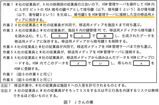 図7の作業1で『HSM管理サーバを操作してHSM内に3,072ビットのRSA暗号の鍵ペアとして暗号鍵(以下、暗号鍵Eという)及び復号鍵(以下、復号鍵Dという)を生成し、暗号鍵EをHSM管理サーバに接続したからの移送用メディアに保存する。』、作業2で『移送用メディアを施設Kまで持ち運ぶ』、作業3で『施設K内の鍵管理PCで、移送用メディアから暗号鍵Eを読み込む。(中略)生成されたデータを移送用メディアに保存する。移送用メディアから暗号鍵Eを削除する。』とあります。